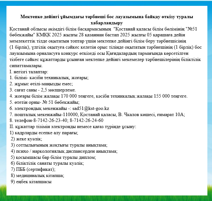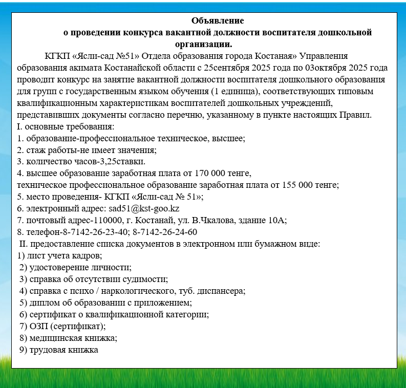 Объявление о проведении конкурса вакантной должности учителя-дефектолога дошкольной организации